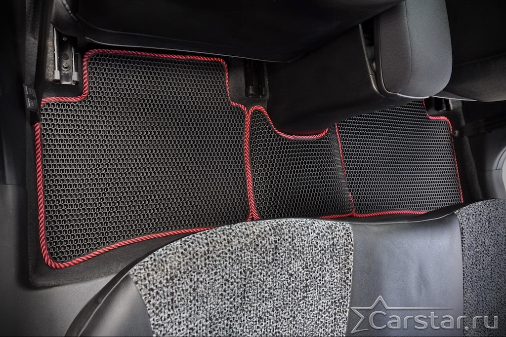 Толщина ковриков EVA составляет 10-12 мм. Глубина ячеек 7-8 мм. Такая толщина ковриков позволяет им служить довольно долго, не протираясь до 3 лет. А благодаря такой глубине ячеек коврик EVA площадью 1 кв.м. способен захватить около 3,5 л жидкости, сохраняя в чистоте вашу обувь и обивку салона.