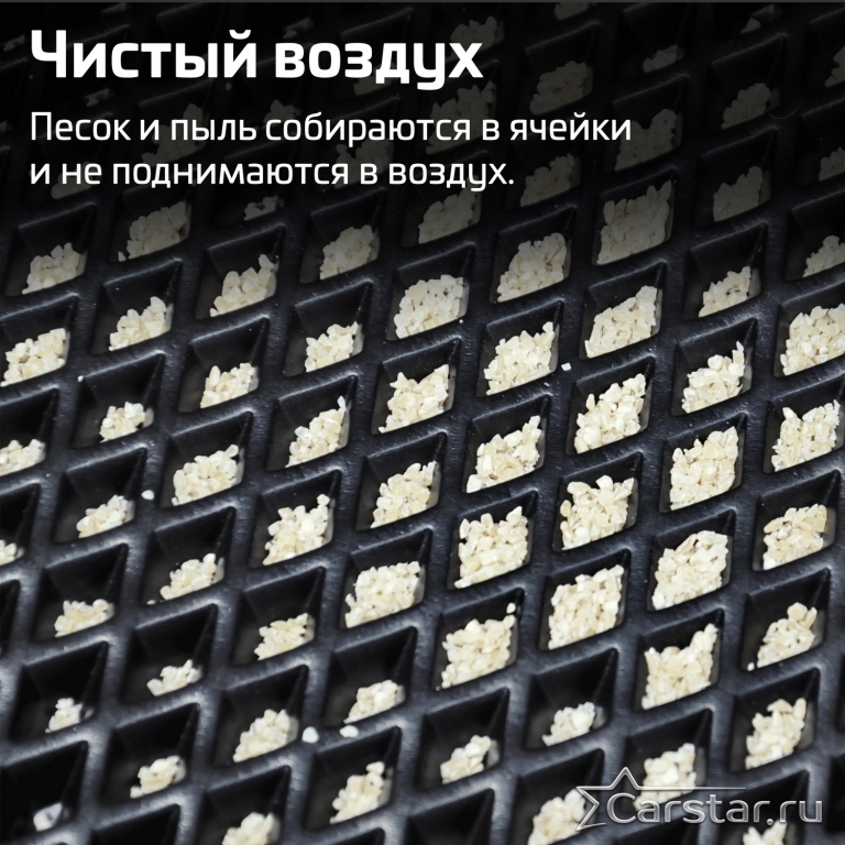 Изделия EVA имеют специальную ячеистую структуру (ячейки глубиной 8 мм), которая эффективно задерживает грязь и воду, оставляя вашу обувь и поверхность обивки салона или багажника абсолютно чистыми. Также эти ячейки очень легко и быстро очищаются без применения специальных инструментов, в том числе, при помощи бесконтактной мойки.