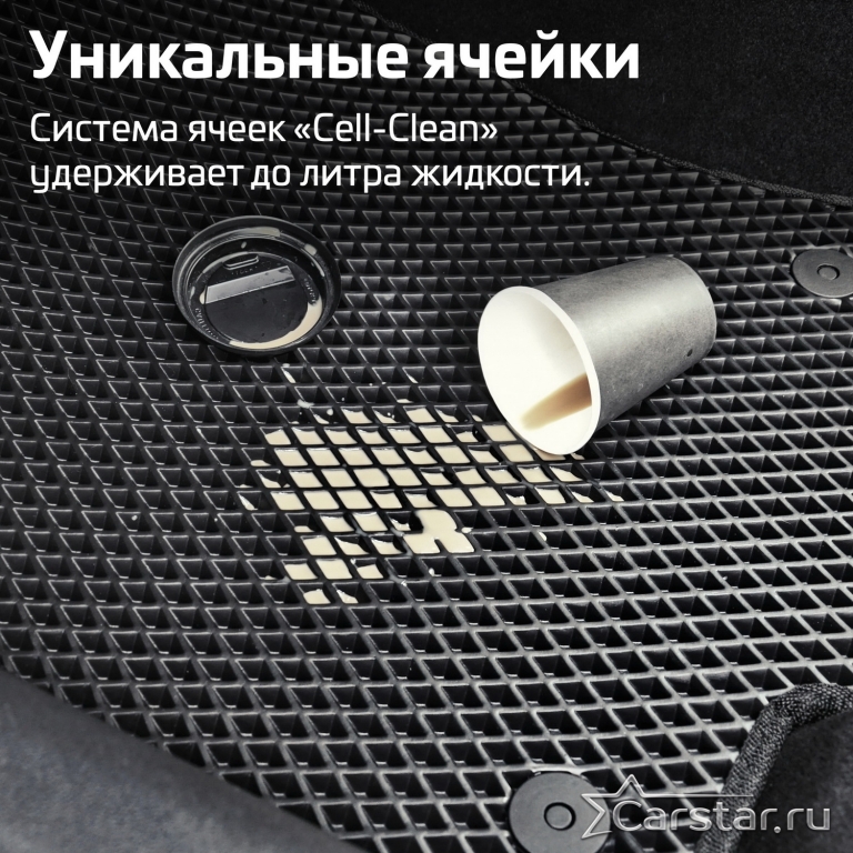 Автомобильные коврики EVA благодаря уникальной ячеистой структуре CELL-CLEAN поддерживают чистоту в салоне на протяжении долгового времени. Коврик EVA площадью 1м² способен захватить около 3,5 литров жидкости или мусора. Вы экономите деньги и время на химчистке, а ваша обувь всегда будет чистой.