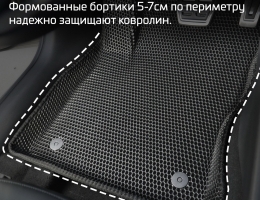 Толщина ковриков EVA составляет 10-12 мм. Глубина ячеек 7-8 мм. Такая толщина ковриков позволяет им служить довольно долго, не протираясь до 3 лет. А благодаря такой глубине ячеек коврик EVA площадью 1 кв.м. способен захватить около 3,5 л жидкости, сохраняя в чистоте вашу обувь и обивку салона.