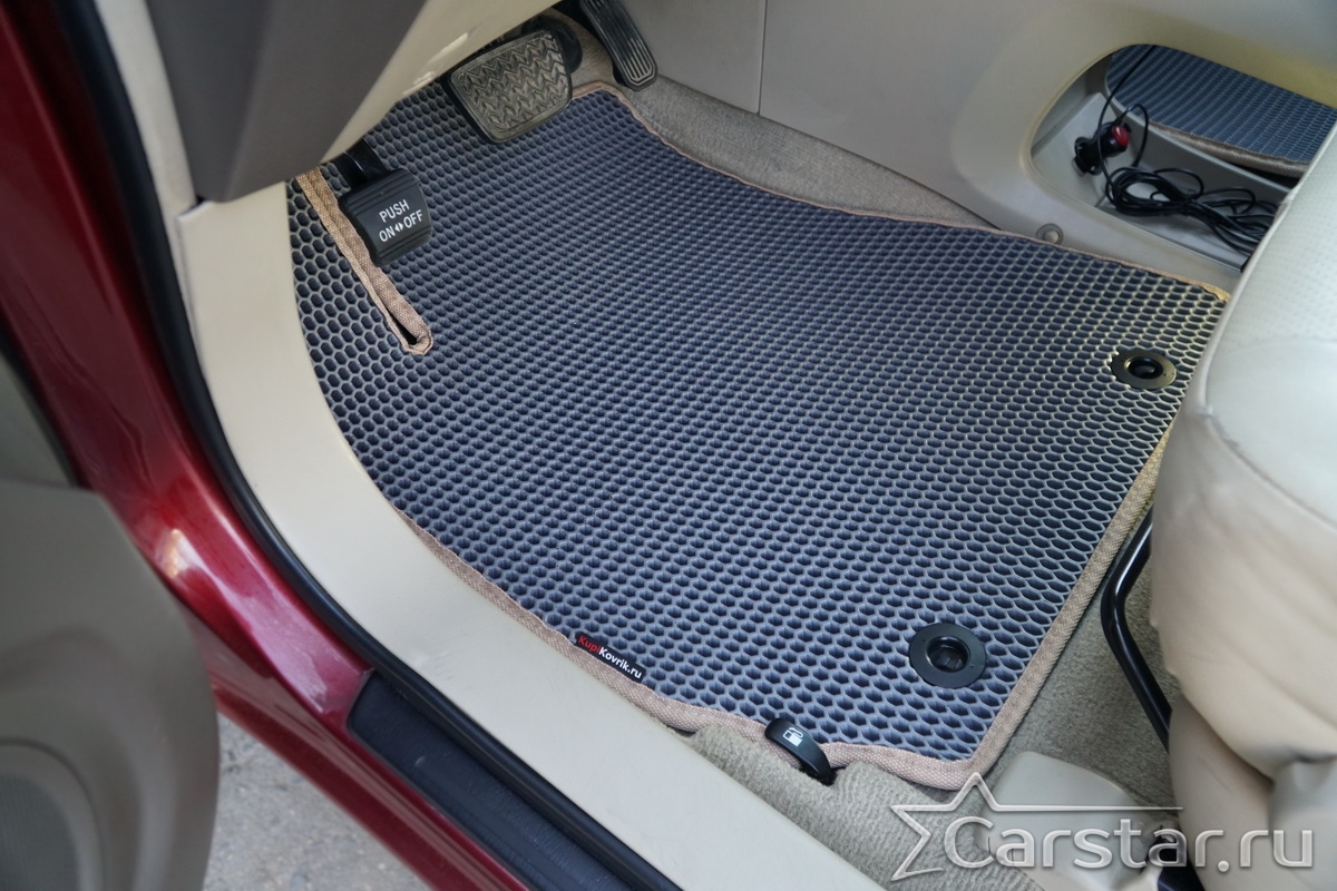 Толщина ковриков EVA составляет 10-12 мм. Глубина ячеек 7-8 мм. Такая толщина ковриков позволяет им служить довольно долго, не протираясь до 3 лет. А благодаря такой глубине ячеек коврик EVA площадью 1 кв.м. способен захватить около 3,5 л жидкости, сохраняя в чистоте вашу обувь и обивку салона.