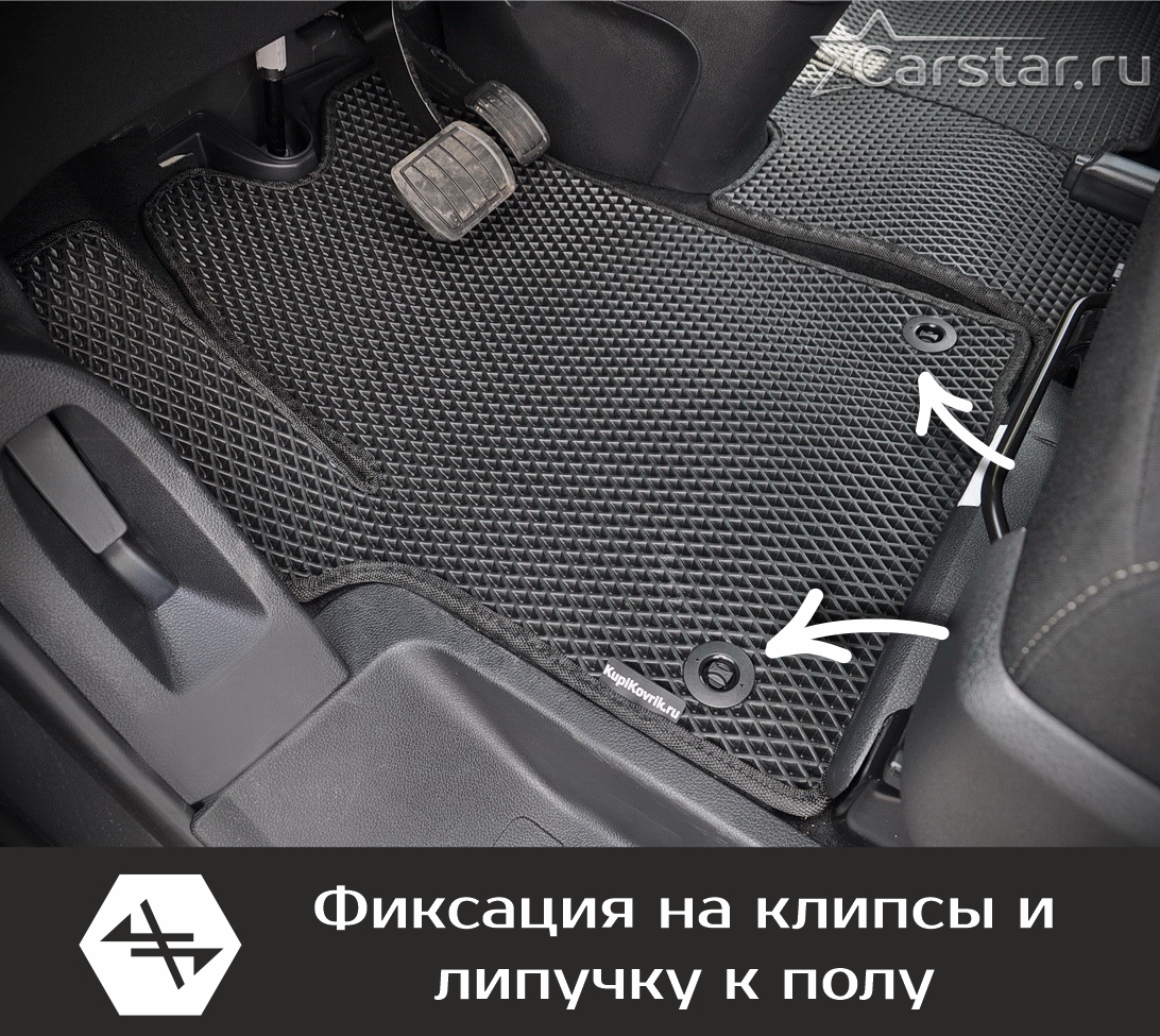 Текстильные коврики надёжно крепятся с помощью оригинальных систем фиксации. Обратная сторона имеет противоскользящее покрытие, что обеспечивает защиту от смещений и безопасность. Максимальное удобство достигается точными лекалами.